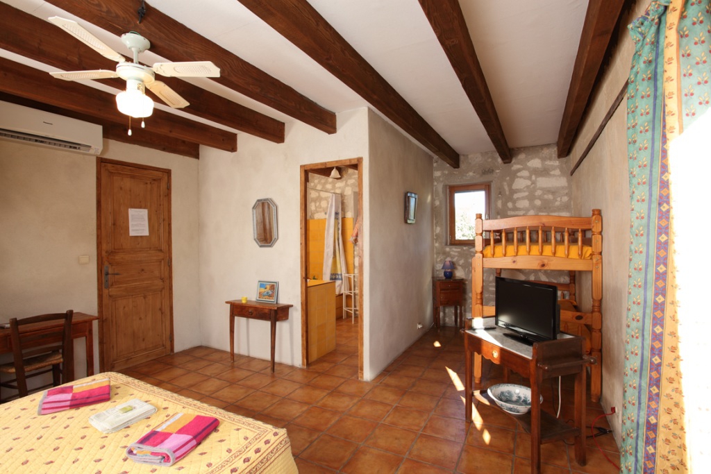 The Yellow Bedroom On the first floor, a big bright bedroom with a southern exposure. A double bed (size 160 cm) and bunk beds (90 x 190 cm) with a separated bathroom. Reversible air conditioning. Free WIFI Yellow Bedroom Image 2 of 5